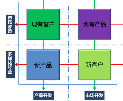 以产品和市场作为两大基本面,区别出四种产品/市场组合和相对应的营销策略来帮助公司达成增加收入的目标,为公司科学地选择战略模式提供帮助和指导。